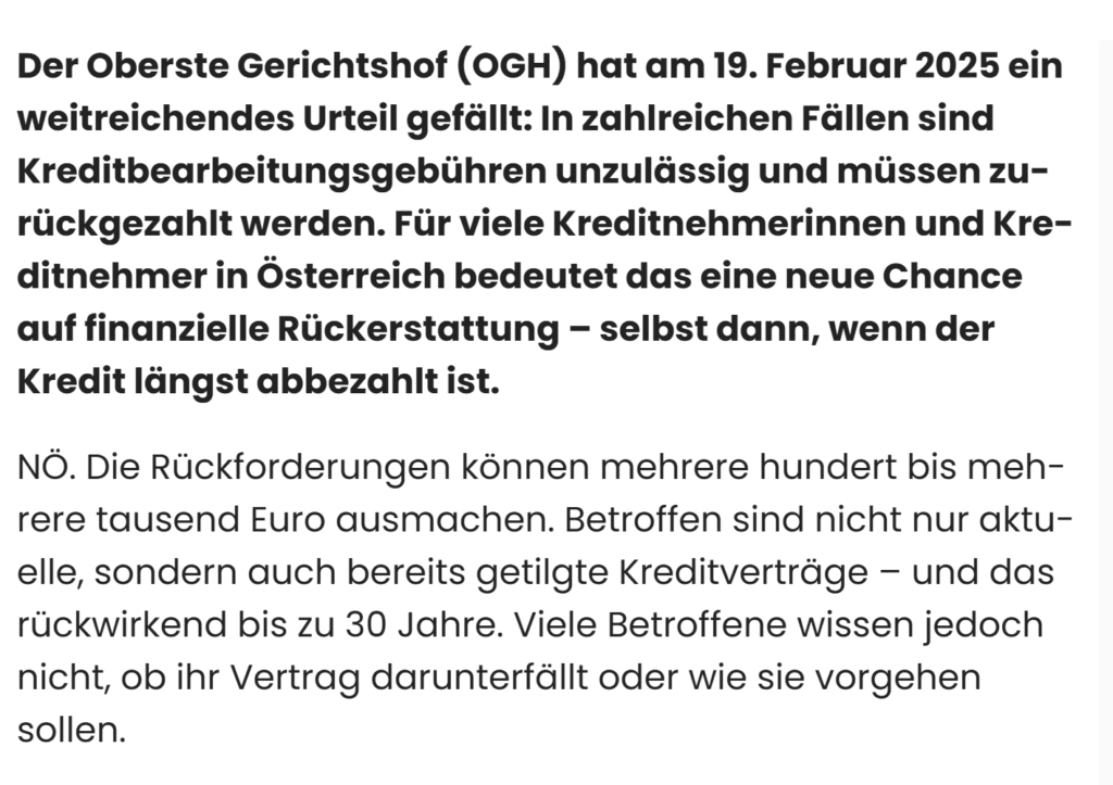 Ja, das funktioniert wirklich – und viele Kreditnehmer in Österreich haben bereits unzulässige Kreditbearbeitungsgebühren erfolgreich zurückerhalten. Mit unserer Hilfe können Sie ein verfahren schnell unkompliziert und ohne Kostenrisiko einleiten.